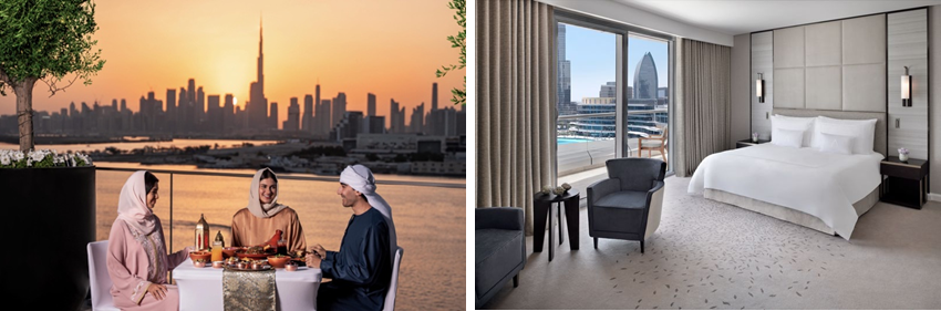 A short walk away, Palace Downtown presents a more tranquil expression of luxury. Defined by palatial Arabian architecture, serene waterways, and views of the Dubai Fountain, the hotel becomes a sanctuary of calm, inviting guests to unwind and reconnect after Iftar in an environment that feels both grand and deeply personal.