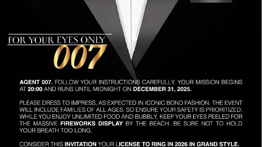 The setup includes Bond-inspired décor, a dedicated photo booth, illuminated pool floats, a champagne wall and chic black-and-white table styling with festive centrepieces and party favours. A cigar collaboration adds a sophisticated touch, while both kids and adults can enjoy themed activities. Formal attire is encouraged, with tuxedos as the dress code hero of the night.