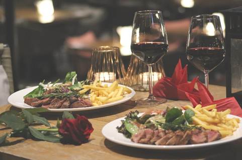 - Two plates of sliced grilled steak served with French fries and leafy salad sit on a wooden restaurant table, accompanied by two glasses of red wine, a candle holder, and a red napkin folded beside the dishes in a dimly lit dining setting.